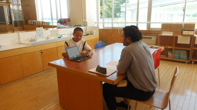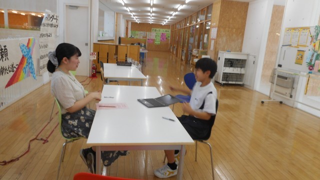 クロムブックを利用しながら、身振り手振りを交えて、英語で説明していました。