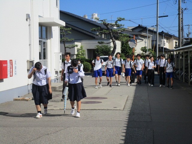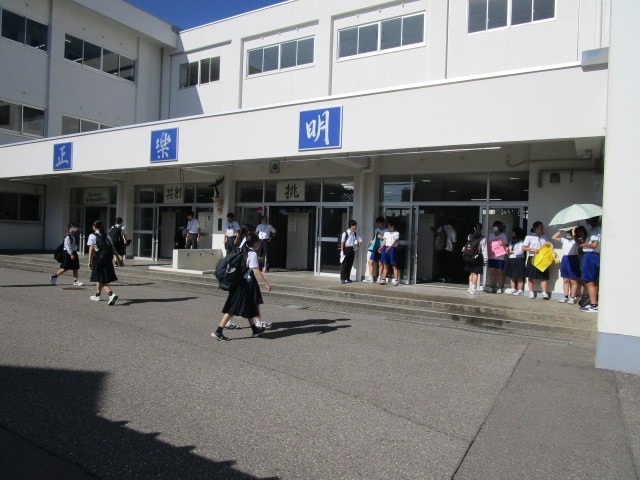 本校では、保護者の皆様には、tetoruにてご案内したとおり、本日より、9月末までの熱中症のリスクが高い期間において、暑さ対策の一環として、登下校をはじめとした学校生活において、普段の服装の選択肢の一つとして、体育服を制服と同様に扱い着用することに致しました。