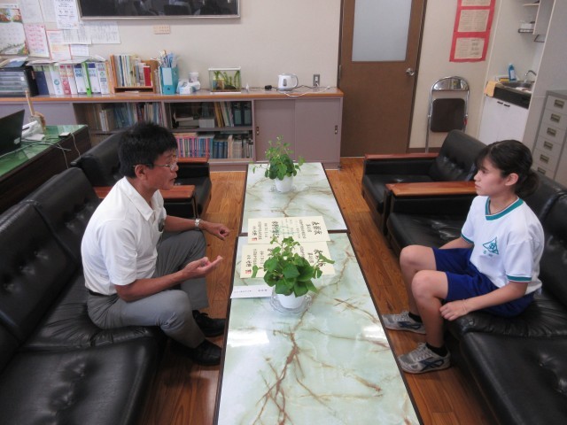 本日、校長室にて先日福井県で開催された北信越中学校総合競技大会バドミントン競技に出場した本校生徒にTH会からの激励金を贈呈しました。