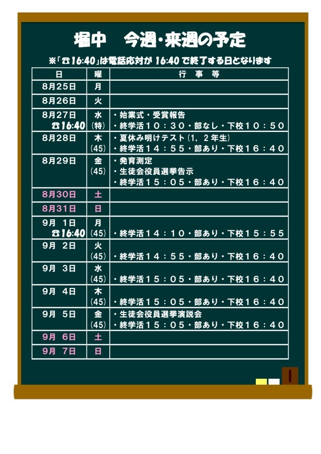8月25日(月)〜9月7日(日)の予定