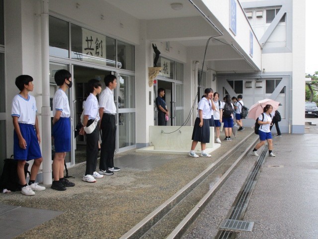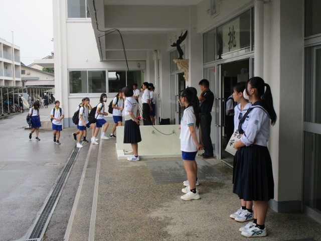 生徒玄関では、生徒会役員選挙の最後の呼びかけが行われています。
