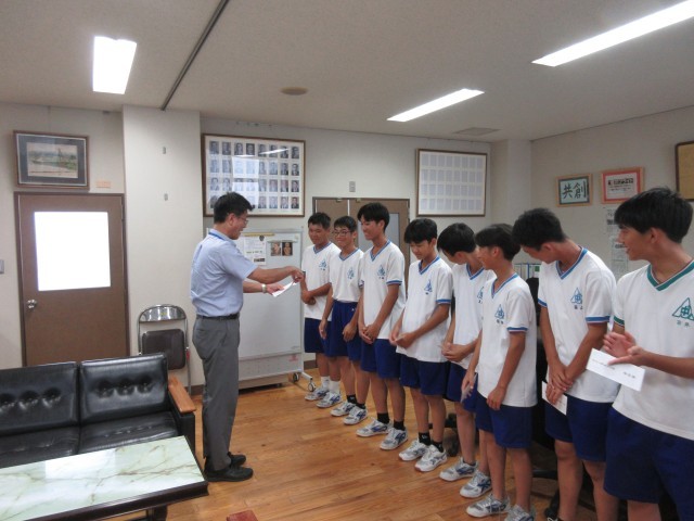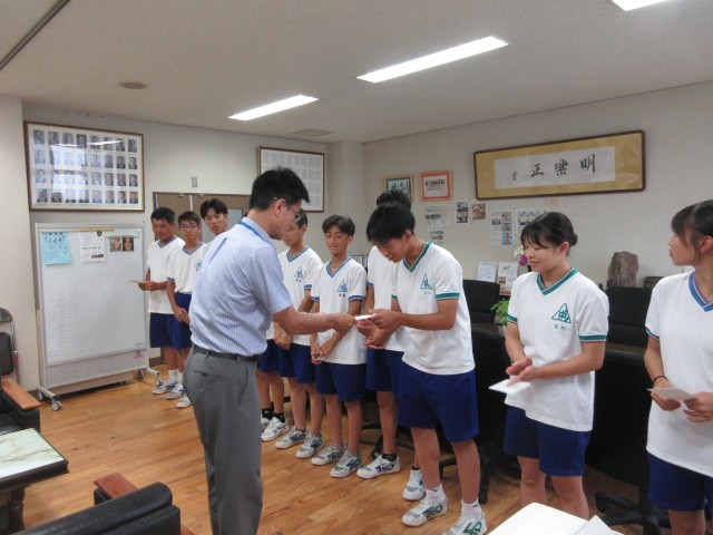 アーティスティックスイミングチャレンジカップ2025、水戸市長旗第15回東日本少年軟式野球大会に出場した本校生徒、10月に開催される第46回JSCAブロック対抗水泳大会に出場する本校生徒に、TH会からの激励金を贈呈しました。
