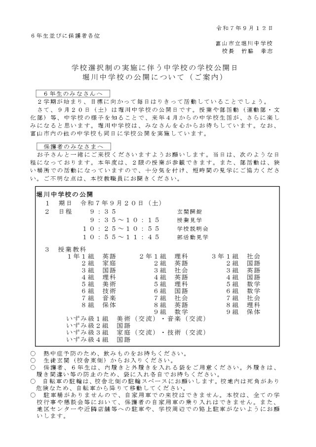 令和7年度 学校選択制の実施に伴う中学校の学校公開日 堀川中学校の公開について(ご案内)