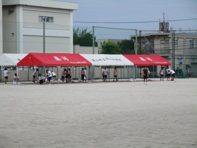 運動会を明日に控え、今朝もグラウンドではテントや放送機器の準備が行われています。