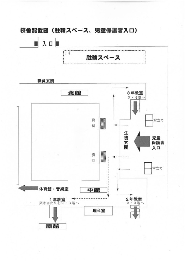 来校される児童、保護者の皆様は、校舎東側にあります生徒玄関よりお入りください。