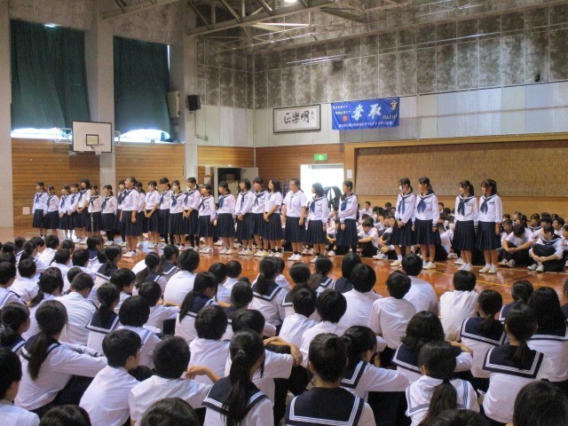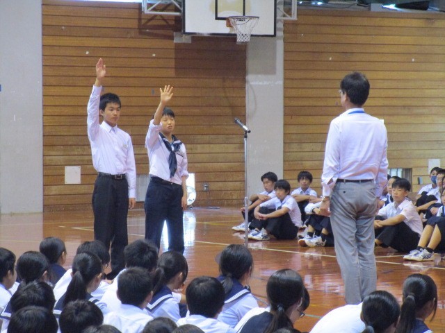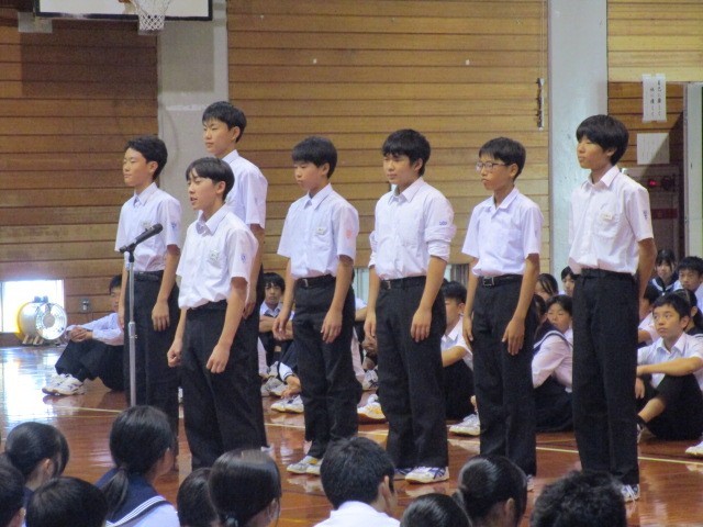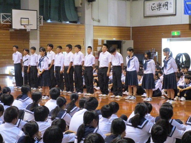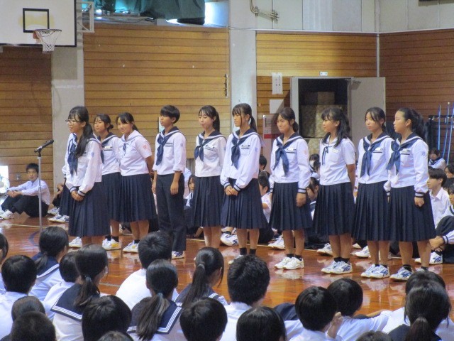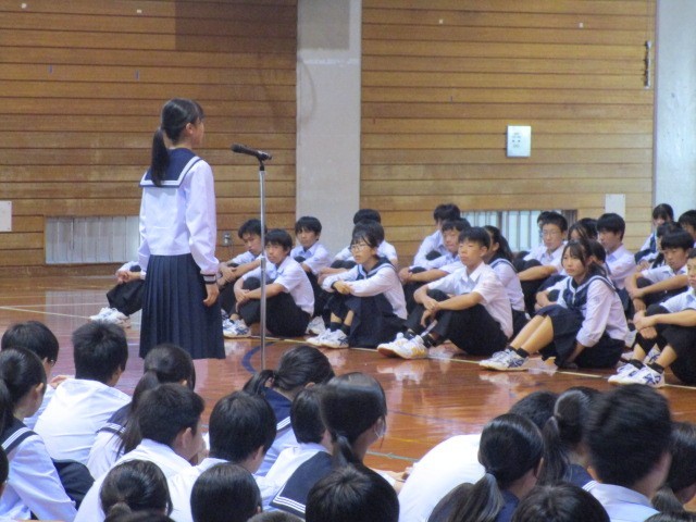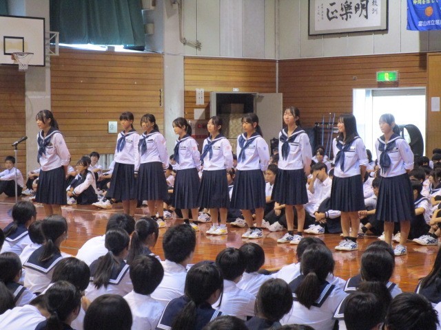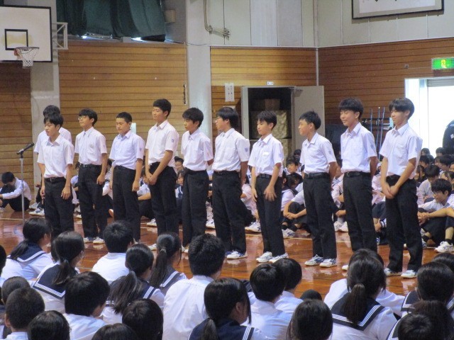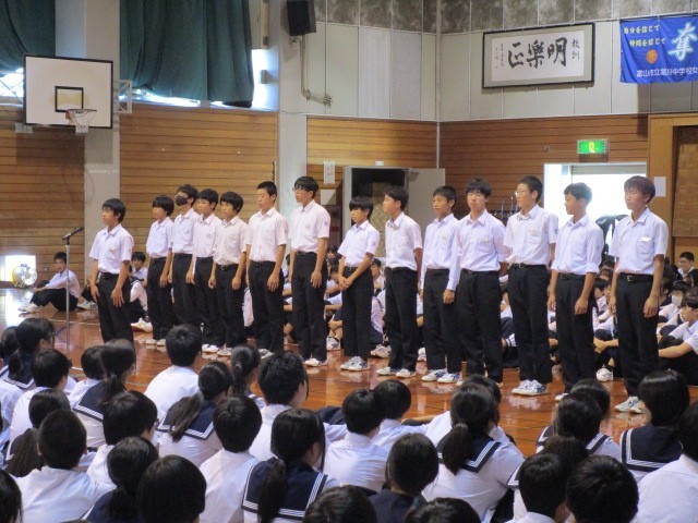 10月6日(月) 壮行会 公開日 2025/10/06 更新日 2025/10/06 部 活 動 等 5限に壮行会が行われ、今週末の富山市中学校新人大会や富山市中学校文化連盟演劇発表、ロボットコンテスト等に出場、参加する部活動やクラブチームの生徒を激励しました。各代表生徒からも、その意気込みが力強く語られ、これまでの活動の成果が実を結ぶよう、祈らずにはいられません。あと数日になりますが、万全の準備を整えて、本番に臨んでください。 +7