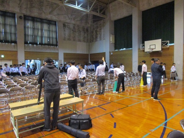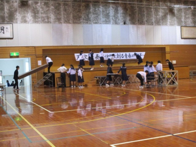 昨日の準備の様子です。担当生徒が熱心に働いています。 おかげで、本日の本番を迎えることができました。次はステージ上で、これまでの練習の成果を発揮してください。