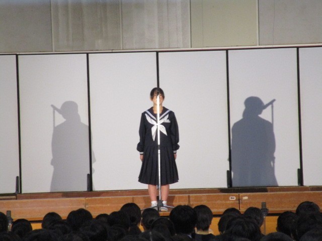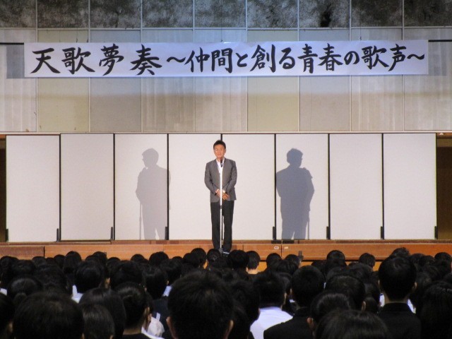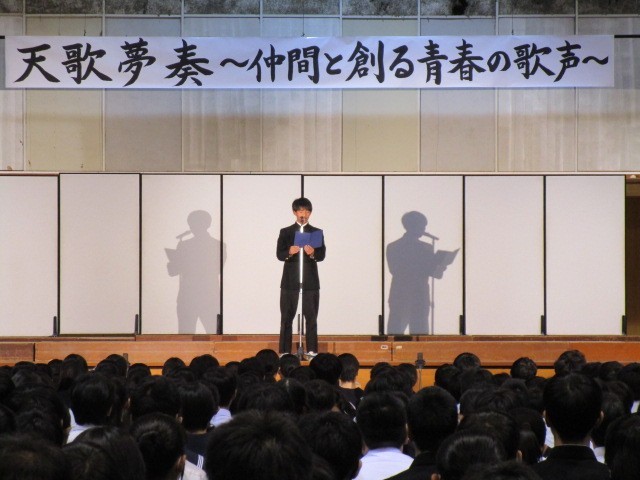 開会式が始まりました。今回は、1年生と3年生が体育館で参加し、2年生はリモートにて教室での視聴となりました。合唱コンクール実行委員の生徒の皆さん、今日一日よろしくお願いします。