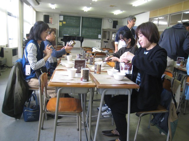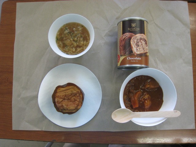 講習終了後は、缶詰やレトルト食品でランチ会をしました。ちょっと素敵な使い捨て容器を使ったり、梱包用の紙をテーブルクロスにしたり、何より温かくておいしい食べ物のおかげで、非常時だとしても気分が少し上向きになる気がしました。