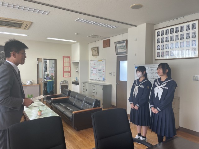 3年生の生徒2名は下校中に、富山駅に向かう市電がどれか迷っている外国の方に、身振り手振りを交えながら英語で富山駅行の電車について説明しました。校長先生は、「困っている人に声をかけ、助けることができ大変すばらしいですね。」と生徒に伝えていました。
