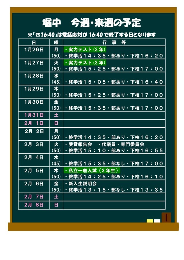 1月26日(月)〜2月8日(日)の予定