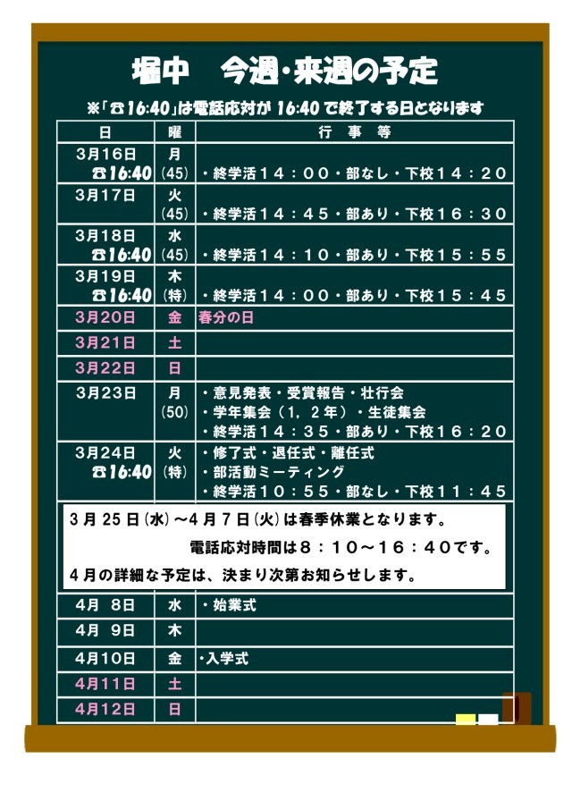 3月16日(月)〜の予定