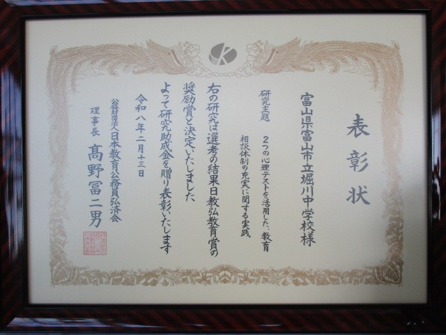 「令和6年度 教育実践研究論文」において、堀川中学校が「最優秀賞(学校部門)」を受賞した論文が、さらに日教弘教育賞の奨励賞を受賞しました。論文の題名は「2つの心理テストを活用した、教育相談体制の充実に関する実践 -教師の「経験と勘」だけに頼らないアセスメントと、的確な支援を目指して-」です。本校では毎年、生徒を対象に2つの心理テスト(「アセス」と「セルフエスティーム」)を行い、その結果を分析し、生徒支援に役立てていますが、その取組を評価いただいたことを大変うれしく思います。この取組を今後も継続して行い、生徒にとって居心地のよい堀川中学校を目指していきたいと思います。