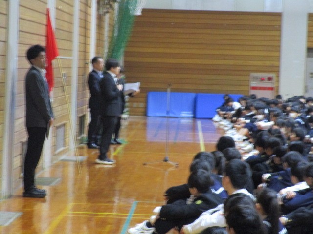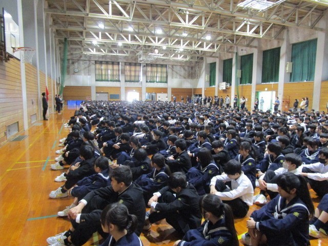 今回は、地震後に火災が発生した設定で、体育館への避難としました。今年度初めての避難訓練でしたが、1,000人を超える全校生徒が混乱することもなく、整然と避難することができました。