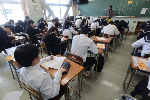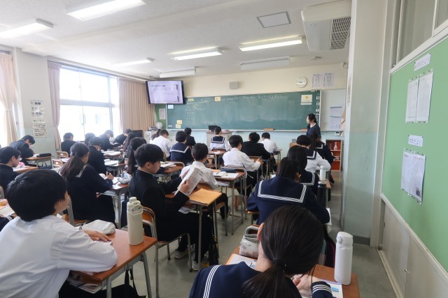 2年生2限の授業の様子です。国語の漢字の確認テストや、英語のリスニングに取り組んでいます。どのクラスも課題に集中し、静かで落ち着いた空気が流れています。