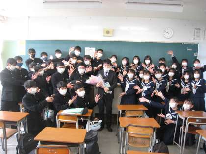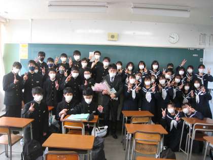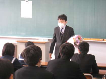 離任式が終わった後、昨年度担任だった1・2年生担当の離任者が、昨年度の自分のクラスの生徒達に最後の授業を行いました。生徒達は涙をこらえつつ、自分の昨年の担任を次の学校へと送り出しました。