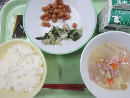 ごはん、ひよこ豆のフライビーンズ、ゆかり和え、豚汁、のり佃煮、牛乳