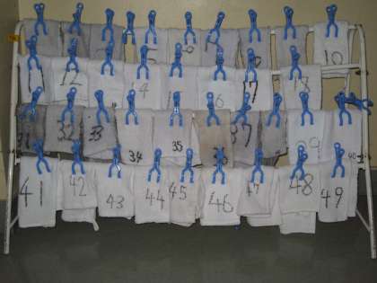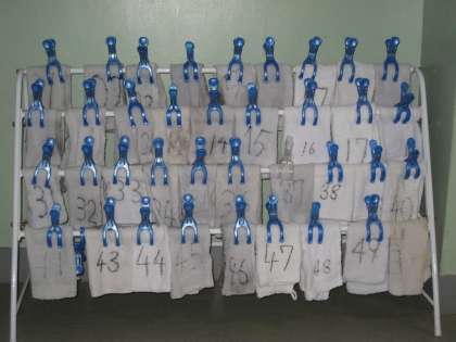 何年も使って少し曲がった雑巾立てに掛けてある雑巾は、どれも丁寧にたたまれています。
