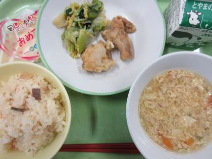 ちらし寿司、鶏肉のから揚げ、チンゲンサイひたし、かきたま、お祝いデザート 、牛乳