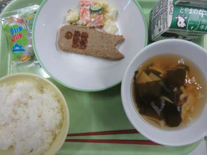 ごはん、鯉のぼりハンバーグ、ポテトサラダ、若竹汁、かしわもち、牛乳