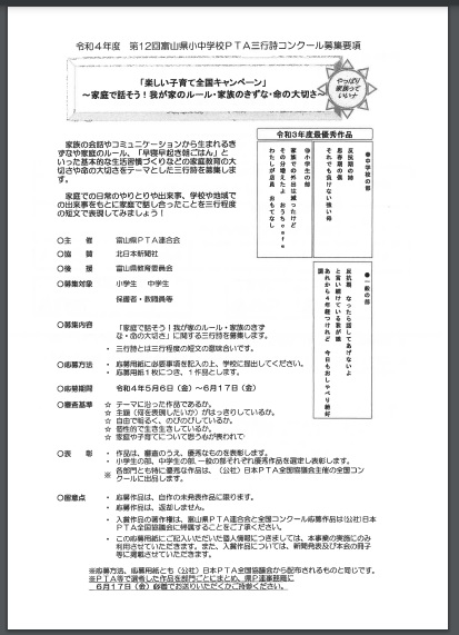 5月1日(日) 第12回富山県小中学校PTA三行詩コンクールについて