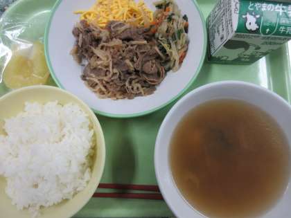 ごはん、焼き肉、ナムル、錦糸卵、中華スープ、冷凍りんご、牛乳