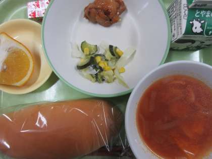 コッペパン、照り焼きチキン、コールスローサラダ、ミネストローネ、ポケットチーズ、甘夏みかん、牛乳