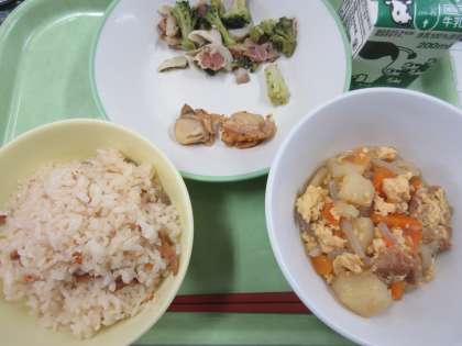 五目ごはん、ホタテの香味焼き、ブロッコリーとエリンギのソテー、油麩の卵とじ、牛乳