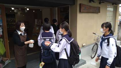 4組 あかね屋に到着、消毒は欠かさずに行います。