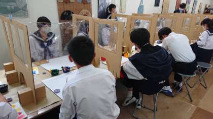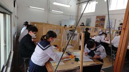 5組 丸益西村屋で友禅染め体験をしています。