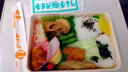 新幹線の車内で食べるお弁当が配布されました。有名な「おむすび弁当」です。
