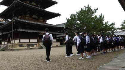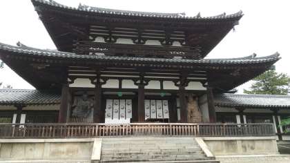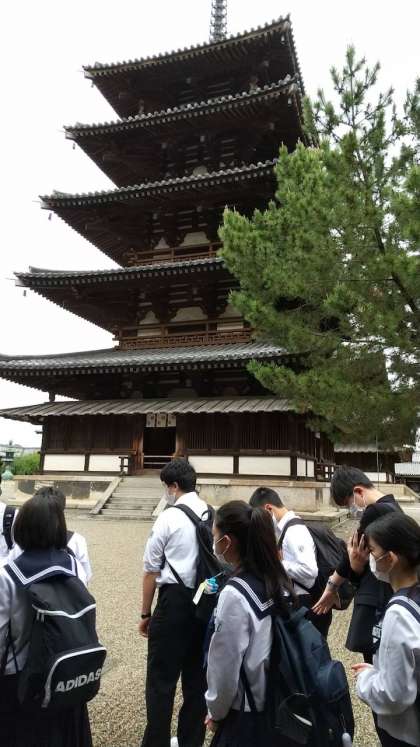 2組 法隆寺に到着しました。拝観中です。天候は曇りで雨は降っていません。