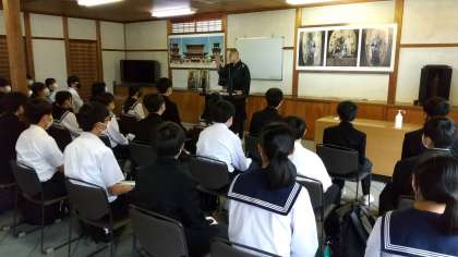 4組 薬師寺で法話を聞いています。とても和やかな雰囲気です。
