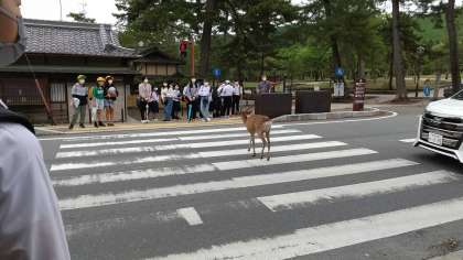 3組 東大寺への道中、鹿のため横断歩道待ちをしています。奈良では、鹿が優先です。
