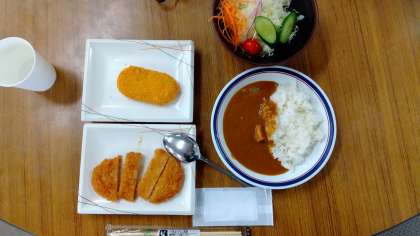 1組 レストラン冨之里で昼食です。カレーライスとサラダ、コロッケ・カツがついています。
