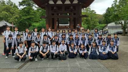 6組 二月堂で集合写真を撮影しました。天気は何とかもっています。卒業アルバム用の写真のため、このようにマスクを外して撮影することもあります。どのクラスも、たくさん撮影しています。