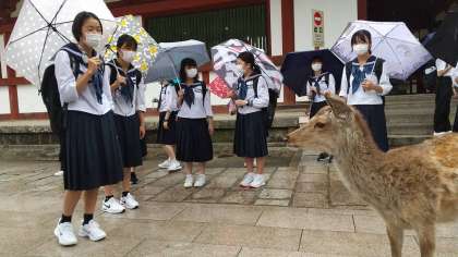 3組 東大寺では、雨の中、あまり鹿とふれあえませんでした。それでも寄ってきます。