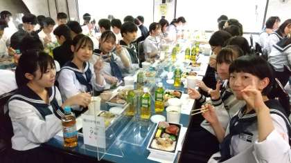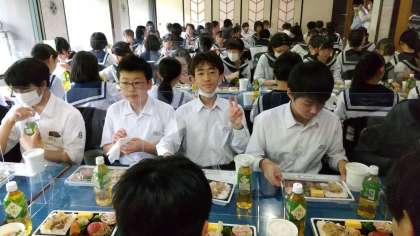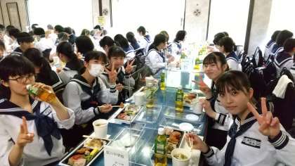 9組 菊一文殊四郎での昼食です。美味しい!という表情で無言で食べています。