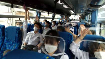 3組 富山に向けて出発しました。疲れている様子の生徒もいますが、バスガイドさんの出してくれるクイズに、みんなでチャレンジしています。