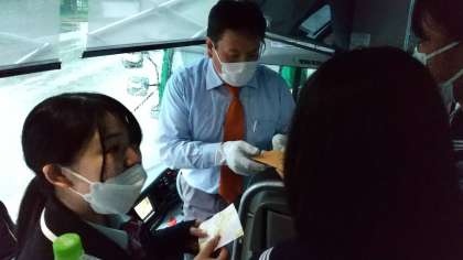 3組 バスを降りる前に、運転手さんとバスガイドさんに、お土産(プレゼント)を渡しました。