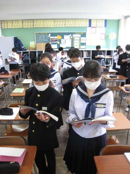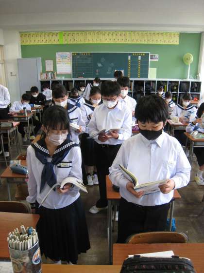 向かい合わず前を向いて音読し、終わったペアは座って練習しています。