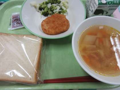 食パン、いちごジャム、コロッケ、花野菜サラダ、ひよこ豆のスープ、牛乳
