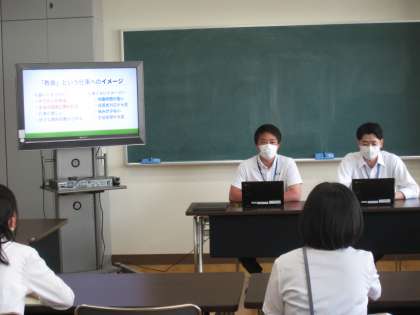 今年度から教員になった2人が、「教員の魅力」について教育実習生に話をしました。