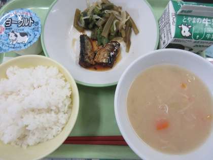 ごはん、いわしの生姜煮、茎わかめサラダ、白玉汁、ヨーグルト、牛乳