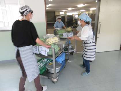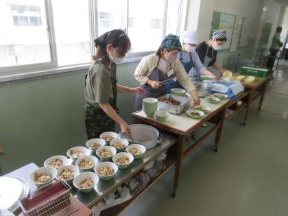 新型コロナウイルス感染対策として、消毒を徹底して配膳を行ったり、密にならないように4教室に分散したりしました。