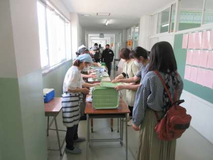 TH会1学年委員長の津幡さんが中心となって、1学年委員の皆さんが、机の消毒や給食配膳等の準備を行いました。