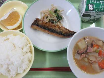 ごはん、さばの塩焼き、香味和え、豚肉の南蛮煮、河内晩柑、牛乳