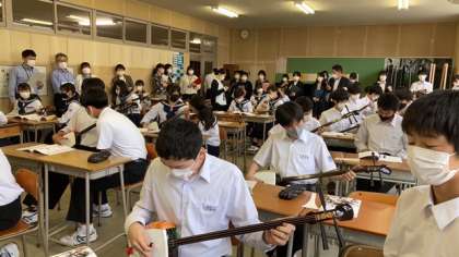 学習課題は、「全員が『こきりこ』の前奏の部分を三味線で演奏できるようになろう。」です。先週は、三味線の外部講師の方が来校され、演奏の仕方を学びました。