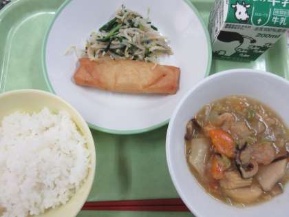 ごはん、春巻き、塩ナムル、八宝菜、牛乳