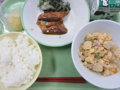 ごはん、ふくらぎの照り焼き、よごし、卵とじ、冷凍りんご、牛乳